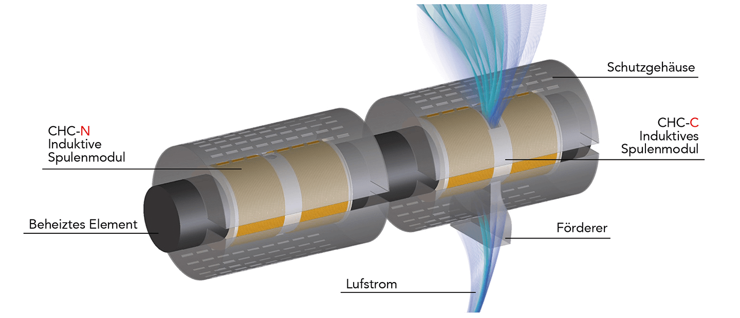 Die typische Anwendung besteht aus einer oder mehreren Spulen, abhängig von der Anzahl der zu beheizenden Zylinderzonen, wobei jede Spule von einem elektronischen Stromgenerator versorgt wird.